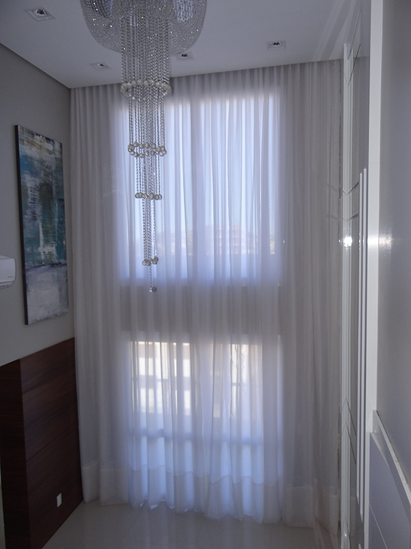 Esta cortina foi utilizado o sistema de abertura por corda, mas poderia ser utilizada o controle remoto pois por causa da altura dificulta a abertura e o fechamento. Foi instalada em um apartamento duplex na área próxima a escada que dá acesso ao andar superior.